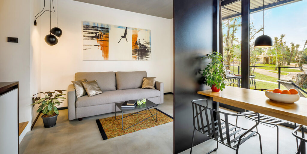 Die Unterkünfte im Aminess Gaia Green Villas umfassen verschiedene Villentypen für 2 bis 8 Personen. Die Villen sind modern und hell eingerichtet, mit Holzböden, Sofa und Schreibtisch ausgestattet. Zur Ausstattung gehören Klimaanlage, Sat-TV, kostenfreies WLAN und Safe. Die Badezimmer verfügen über eine begehbare Dusche, getrennte Toilette und Haartrockner. Viele Villen bieten eine möblierte Terrasse mit Blick auf den Garten. Die Unterkünfte sind in vier Größen bzw. Typen aufgeteilt: Lilium (für Paare), Salvia und Pinus (ideal für Familien) sowie Olea (für größere Gruppen). Einige Villen verfügen über einen privaten Pool. Die Villen bieten eine perfekte Synergie aus Architektur und Natur sowie viel Privatsphäre in ruhiger Umgebung